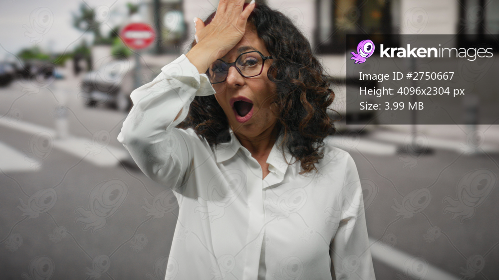 Woman with curly hair in white shirt on city street showing surprise and disbelief outdoors under cloudy sky in urban setting wearing glasses.