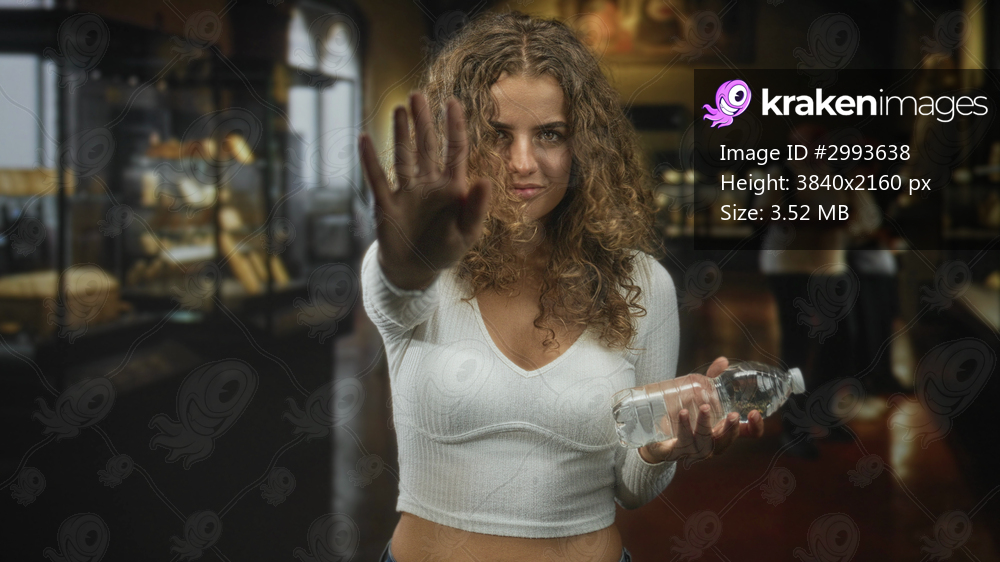 Woman with curly hair in white sweater holding a water bottle, palm raised forward in stop gesture toward camera in a museum building with blurred visitors; defiance boundary. - Kraken Images