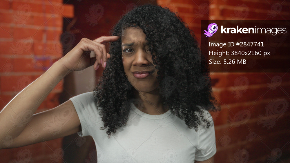Woman with curly hair in white t shirt points finger to head against brick wall in building interior; thinking.