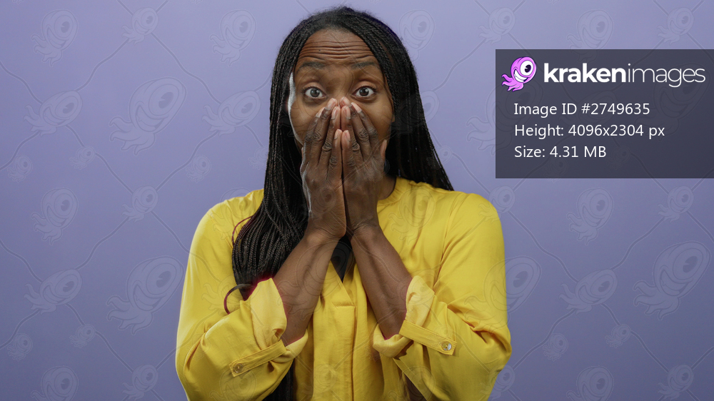Woman with curly hair in yellow shirt showing surprise against purple background isolated over wall adult female beautiful person