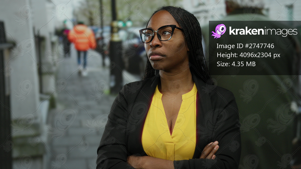 Woman with curly hair in yellow shirt stands confidently on urban street with glasses and arms crossed, blending determination with city life.