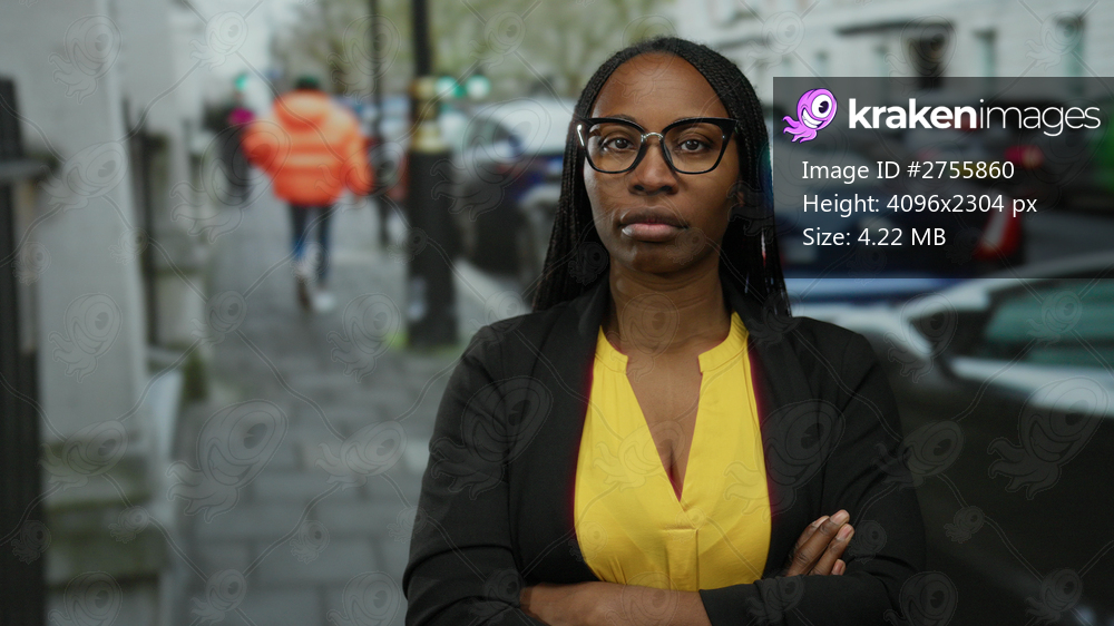 Woman with curly hair in yellow shirt stands confidently on urban street with glasses and arms crossed, blending determination with city life.