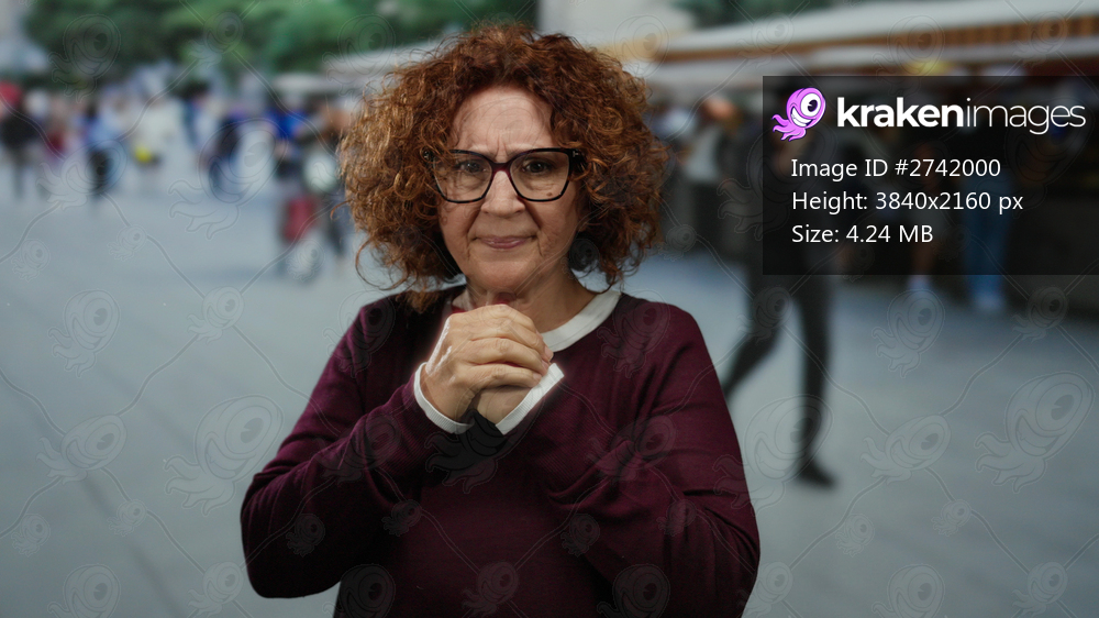 Woman with curly hair looking concerned on a busy market street with blurry people in the background, wearing glasses and a burgundy sweater, expressing worry or anxiety. - Kraken Images