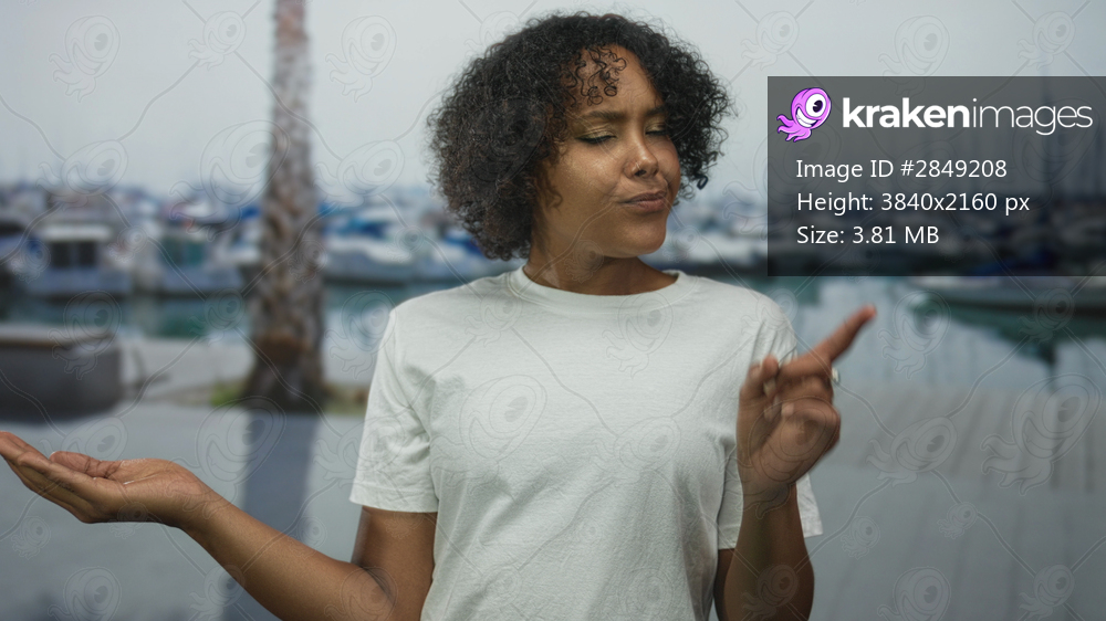 Woman with curly hair and nose ring points index finger in front of building to signal refusal gesture; disapproval.