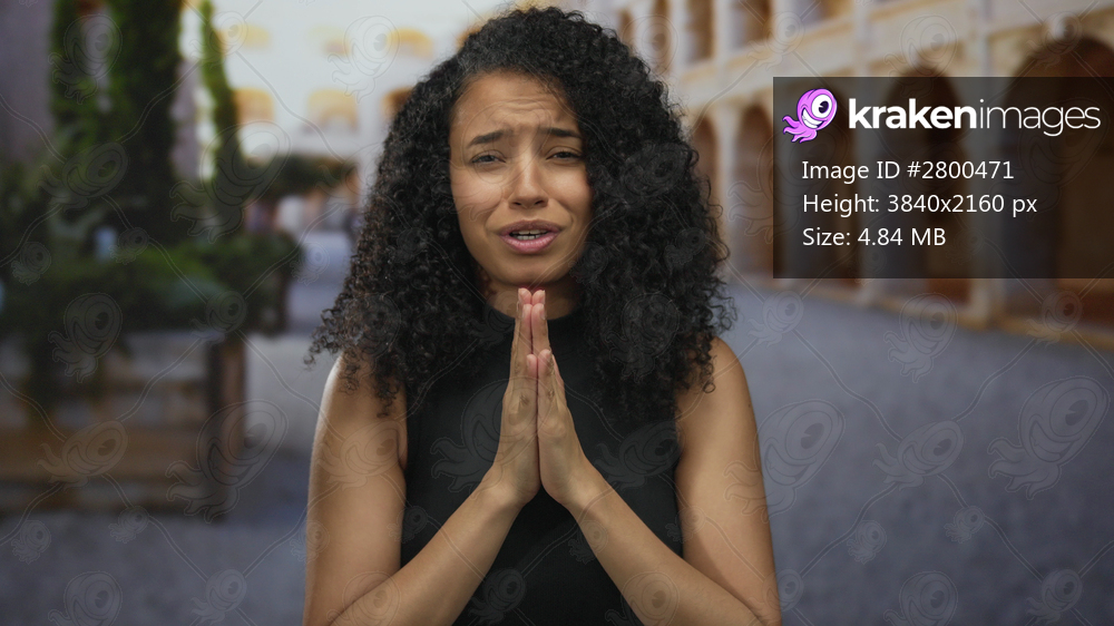 Woman with curly hair on an old town street clasps hands with a hopeful expression in a sunny outdoor setting.