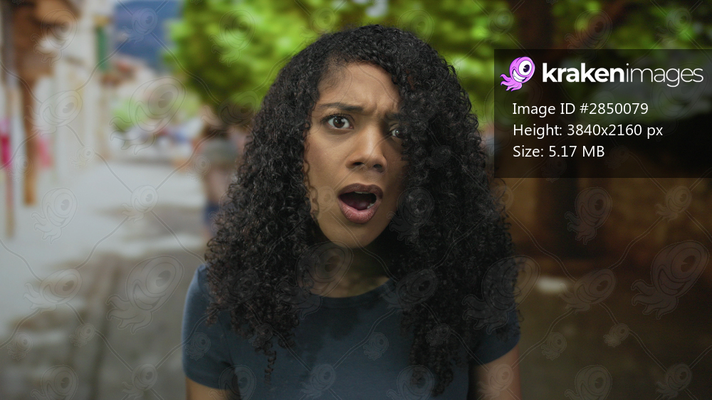 Woman with curly hair opens mouth and furrows eyebrows on old town cobblestone street; surprise disbelief.
