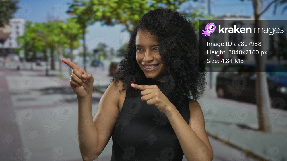 Woman with curly hair pointing in a playful manner on a city street under sunny weather with trees and buildings in the background.