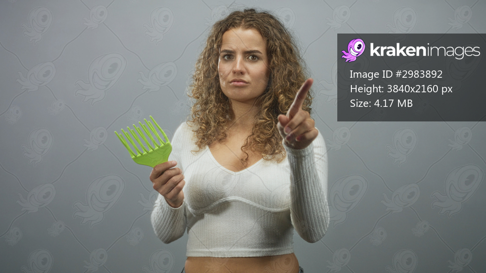 Woman with curly hair points finger while holding a green wide tooth comb and wearing a white crop top in a studio setting; confidence self care.
