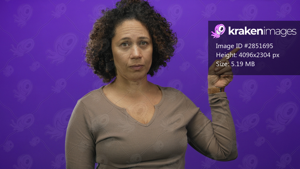 Woman with curly hair points index finger to the right in a purple studio side view; confidence guidance.