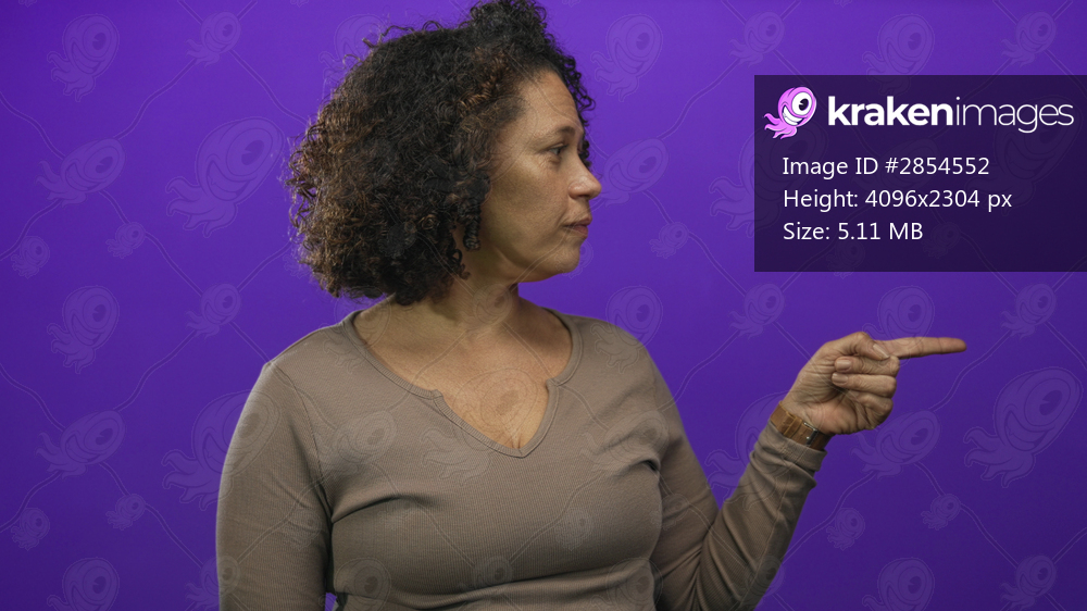 Woman with curly hair points index finger to the right in a purple studio side view; confidence guidance.