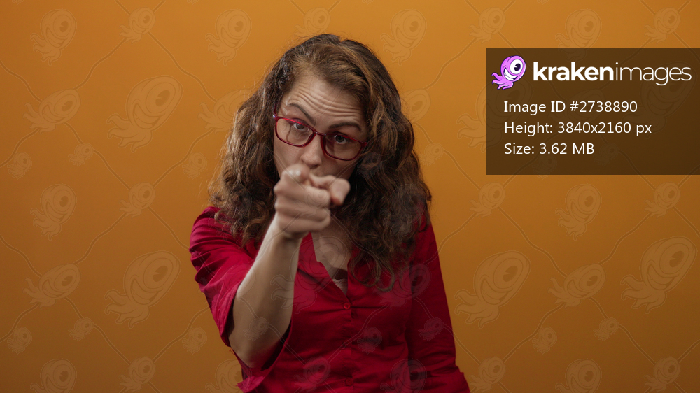 Woman with curly hair and red glasses in a red shirt gesturing angrily against an orange background setting an assertive mood