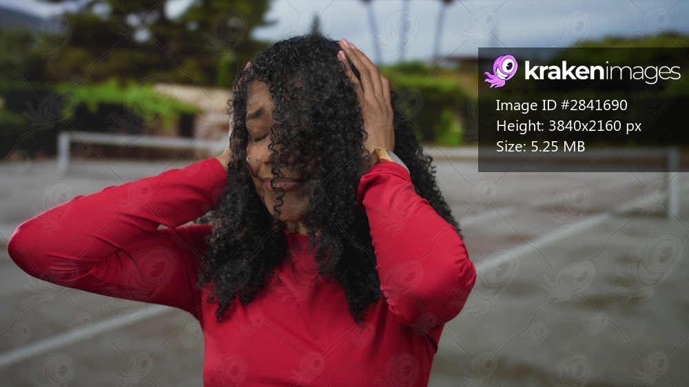 Woman with curly hair and red long sleeve shirt covers ears on outdoor tennis court painted court lines and net post visible; annoyance.