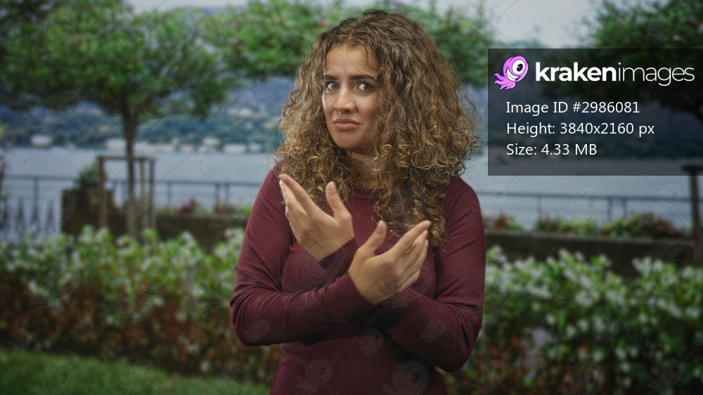 Woman with curly hair rubbing her wrist and wincing, hands clasped in front by a lakeside street railing with trees and grass; unease reflection.