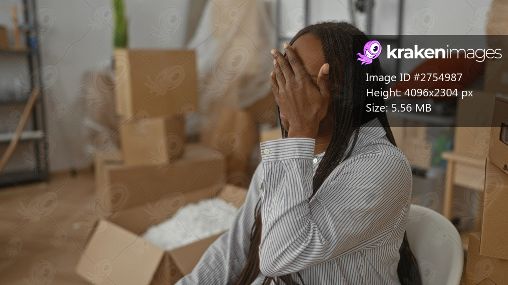 Woman with curly hair sitting indoors surrounded by moving boxes in a new apartment, appearing contemplative and thoughtful.