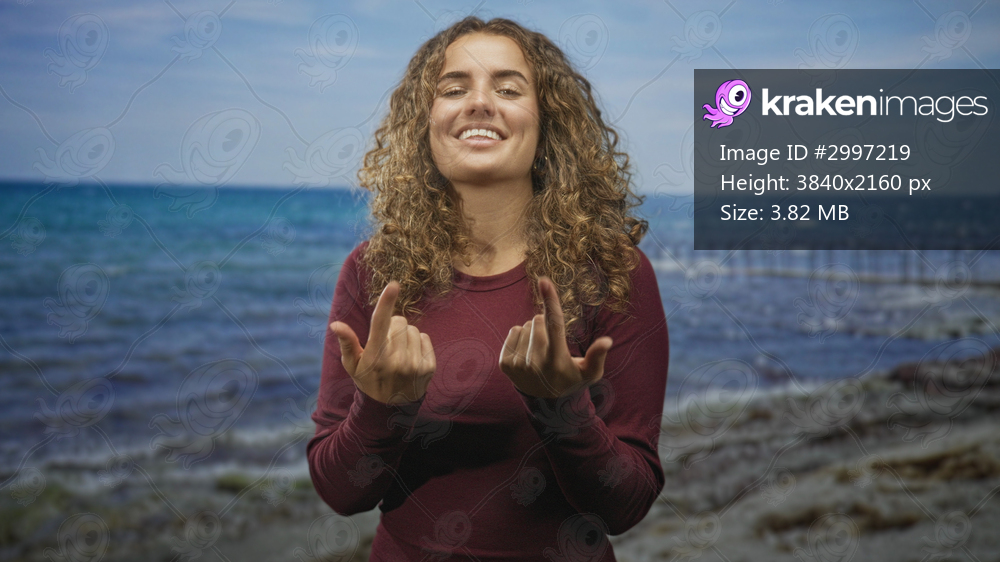 Woman with curly hair smiles and holds palms up, beckoning at a beach pier in a burgundy sweater with sunlit shoreline; welcoming warmth.