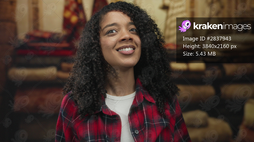 Woman with curly hair smiles, showing mouth and standing before stacked carpet rolls inside building; curiosity wonder interest exploration.