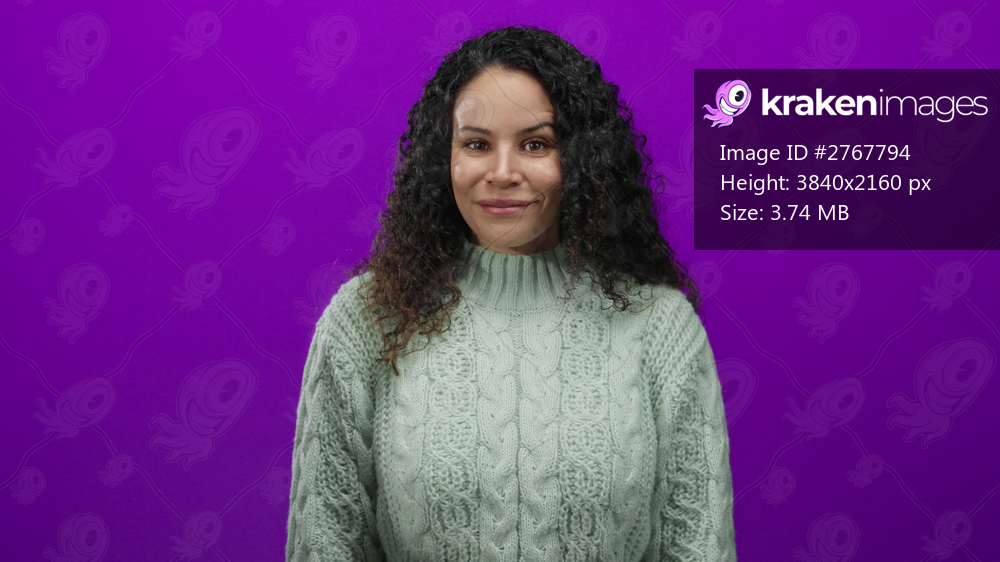 Woman with curly hair smiles and winks on a vibrant purple background wearing a cozy sweater capturing a playful mood in a studio setting.