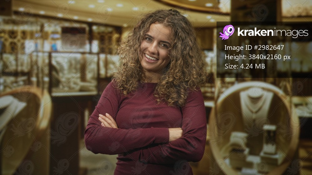 Woman with curly hair smiling, arms crossed beside jewelry display and necklace busts in a jewelry store building; confidence.