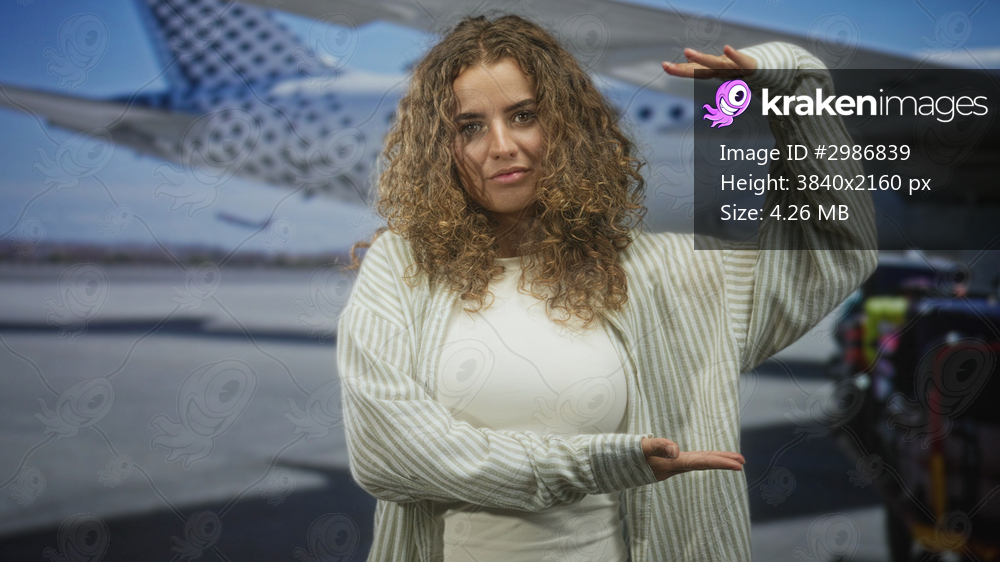 Woman with curly hair smiling, framing space with hands in front of a parked airplane at airport terminal; joyful travel inspiration.