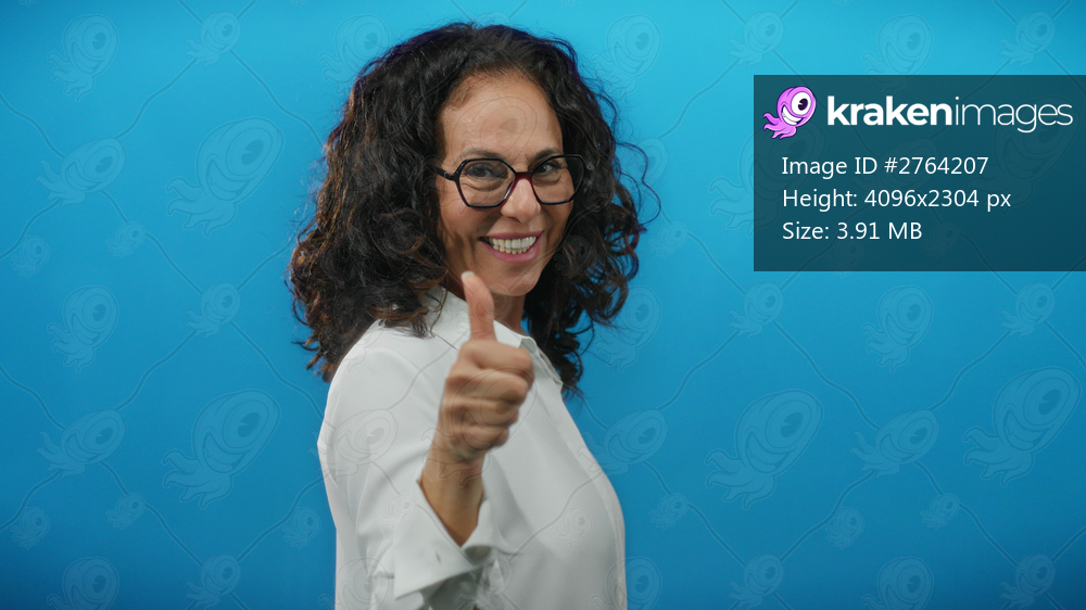 Woman with curly hair smiling and giving a thumbs-up against a blue background, exuding happiness and confidence in a cheerful and isolated setting.