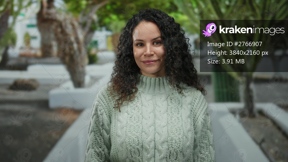 Woman with curly hair smiling in an outdoor park setting wearing a cable-knit sweater, surrounded by lush green trees in a peaceful environment on a clear day. - Kraken Images