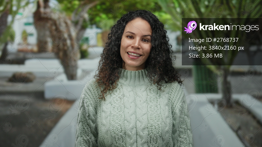 Woman with curly hair smiling in an outdoor park setting wearing a cable-knit sweater, surrounded by lush green trees in a peaceful environment on a clear day. - Kraken Images