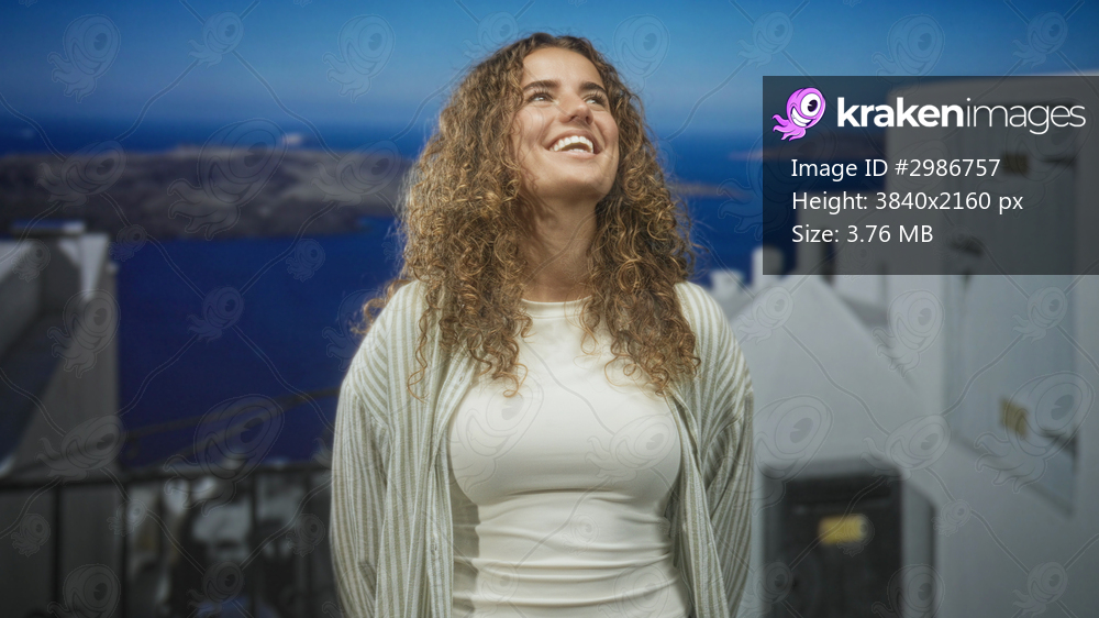 Woman with curly hair smiling and looking upward, bust visible, wearing white top and cardigan on a building terrace overlooking the sea; serenity travel. - Kraken Images