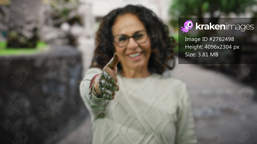 Woman with curly hair smiling outdoors in a city street, extending a handshake with a gloved hand.