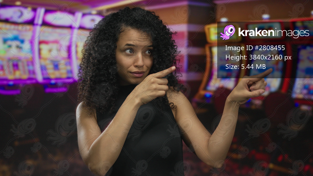 Woman with curly hair smiling and pointing in a colorful casino setting with slot machines indoors, creating a lively and engaging atmosphere.