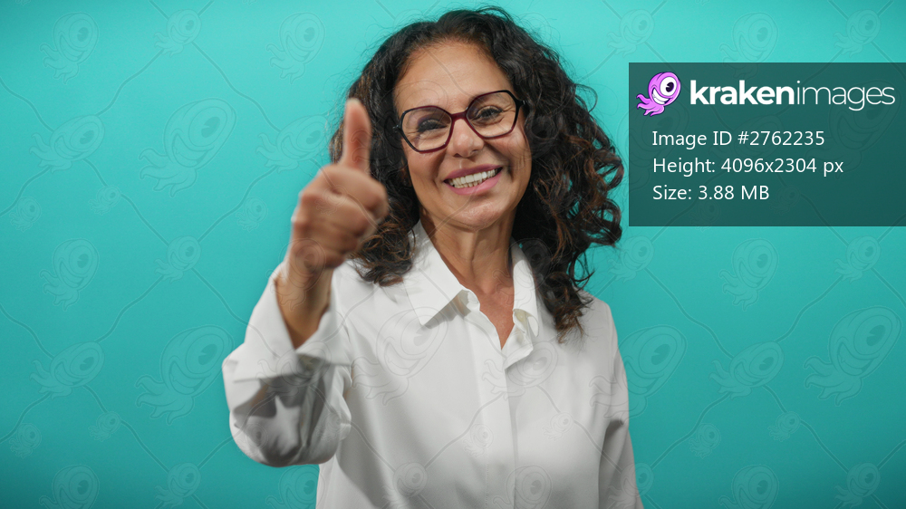 Woman with curly hair smiling and showing thumb up gesture against a blue background wearing a white shirt and glasses, conveying positivity and confidence. - Kraken Images