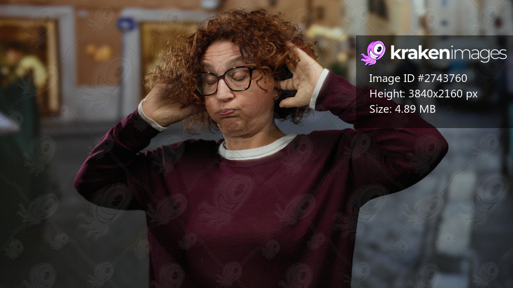 Woman with curly hair stands on city street covering ears with hands, wearing glasses and maroon sweater, illustrating frustration or noise disturbance outdoors. - Kraken Images