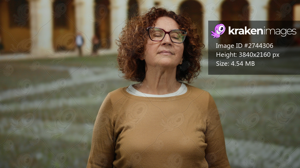 Woman with curly hair stands outside a historic university building, wearing glasses and a brown sweater, eyes closed in peaceful contemplation on a sunny day. - Kraken Images