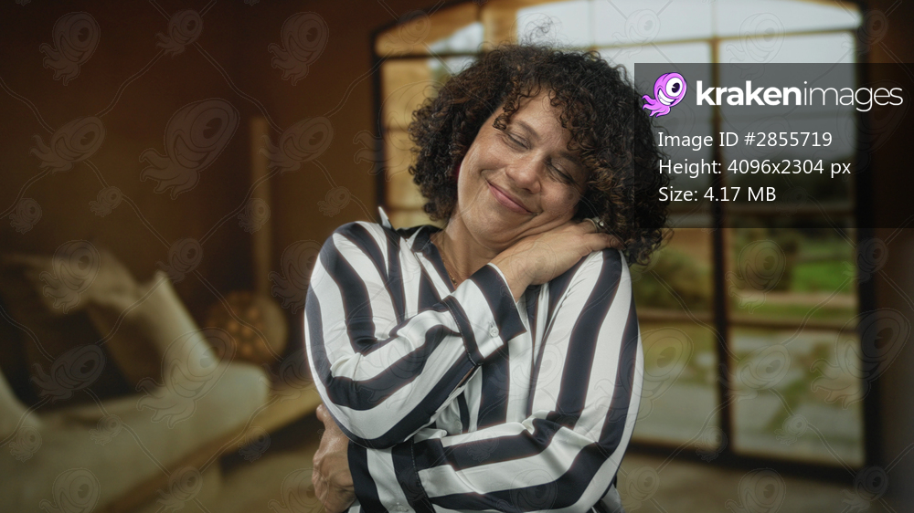 Woman with curly hair and striped shirt holds shoulder with crossed arms in a building by large window; comfort.