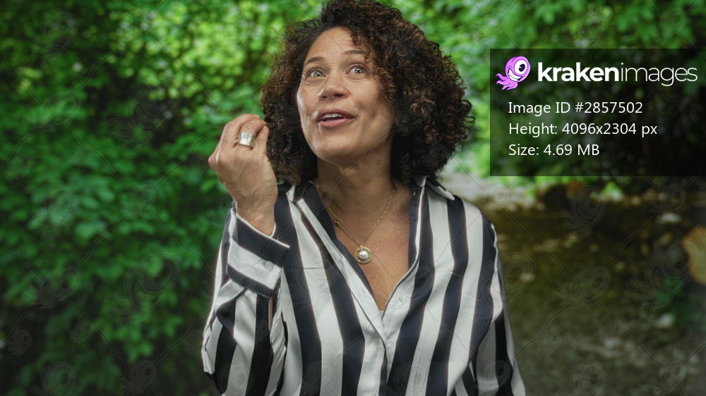 Woman with curly hair and striped shirt pinches fingers for kiss gesture in green park with lush foliage; delight.