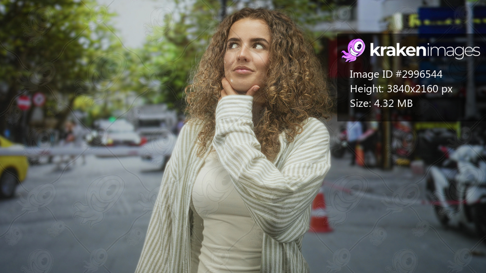Woman with curly hair touching her chin, hand on chin gesture, standing on a busy street by a taxi and scooters; thoughtful reflection.