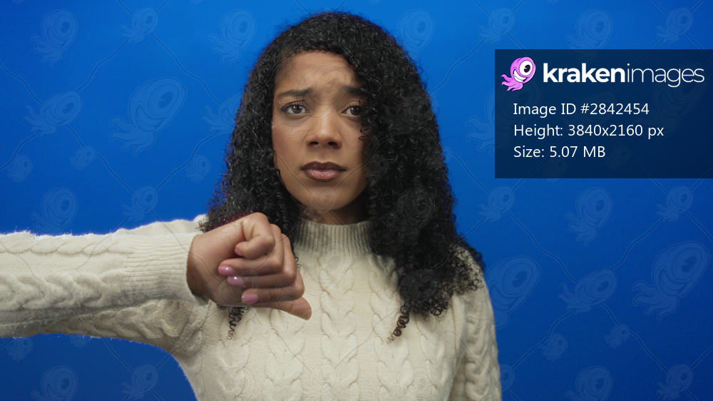 Woman with curly hair wearing a cream cable knit sweater holds thumbs down gesture in blue studio setting; rejection.