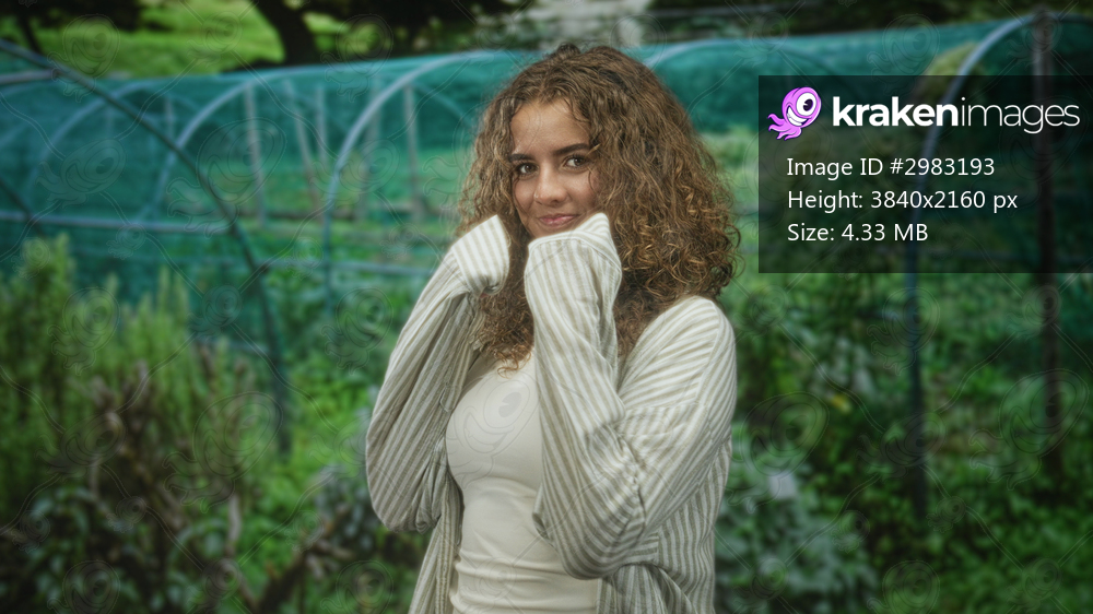 Woman with curly hair wearing a striped cardigan and cream tanktop, hands tucked in sleeves near face gesture in greenhouse; contentment nature connection. - Kraken Images
