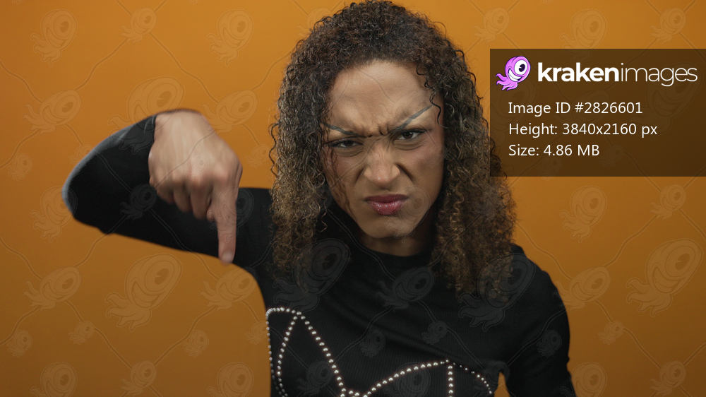 Woman with curly hair wearing black studded top points finger upward in bright orange studio space; curiosity.