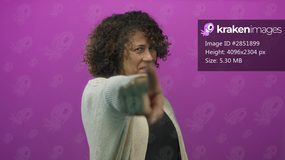 Woman with curly hair wearing cardigan and black shirt with finger pointing to camera in studio setting; confidence.