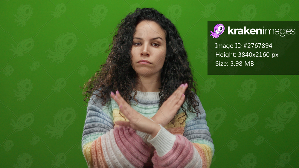 Woman with curly hair wearing colorful sweater gesturing stop with arms crossed against green background