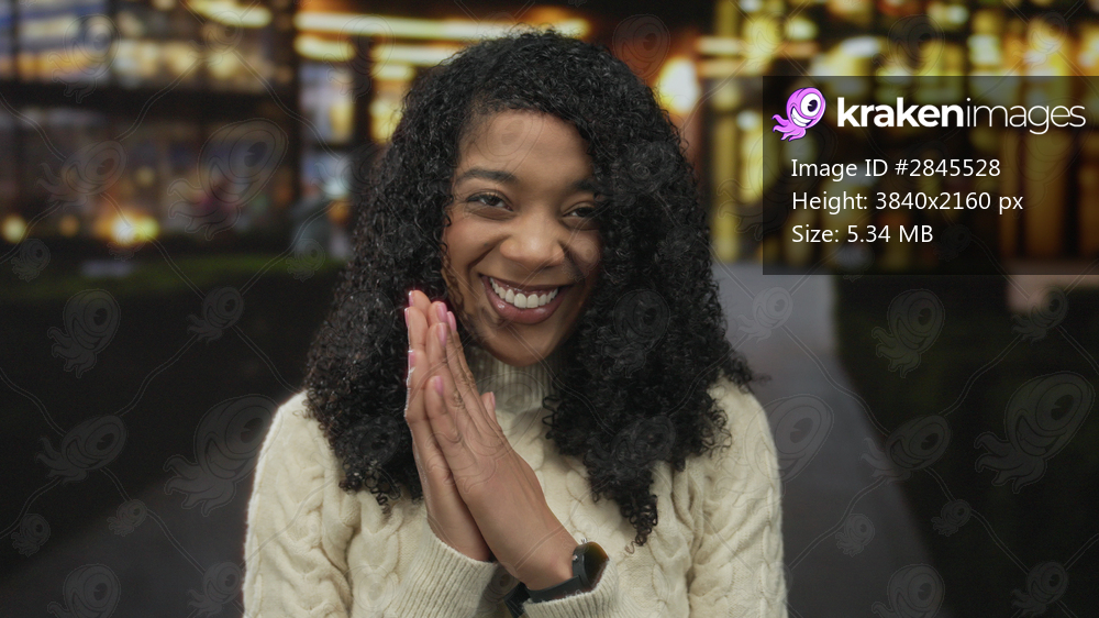 Woman with curly hair wearing cream sweater and smartwatch claps hands and smiles broadly under building lights; joy.