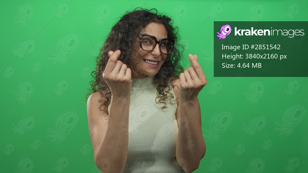 Woman with curly hair, wearing glasses and a ring, pinches fingers in green studio; money excitement.