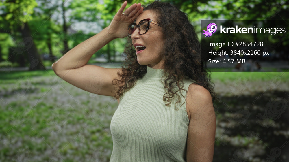 Woman with curly hair wearing glasses raises hand to shield eyes in sunlit forest clearing; serenity.
