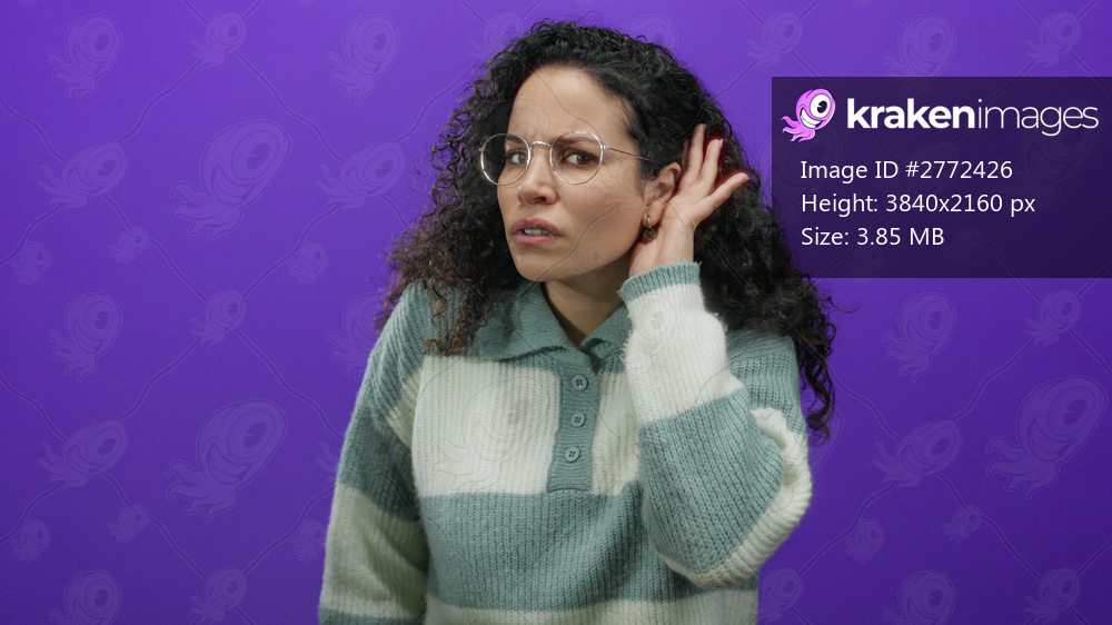 Woman with curly hair wearing glasses stands against an isolated purple background, listening intently and touching her ear, conveying curiosity and focus. - Kraken Images