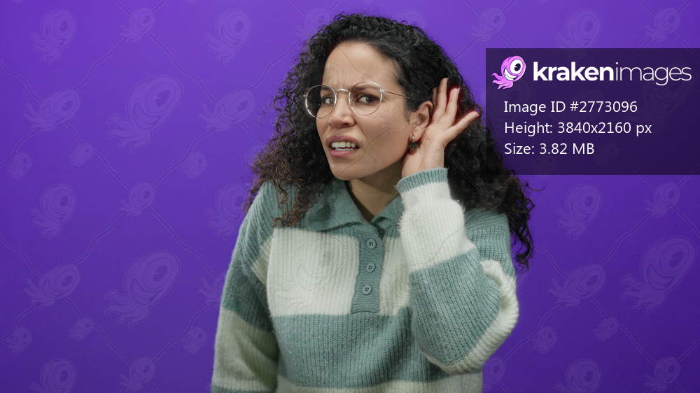 Woman with curly hair wearing glasses stands against an isolated purple background, listening intently and touching her ear, conveying curiosity and focus. - Kraken Images