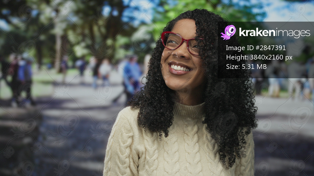 Woman with curly hair wearing red glasses and a cable knit sweater smiles in green forest; happiness.
