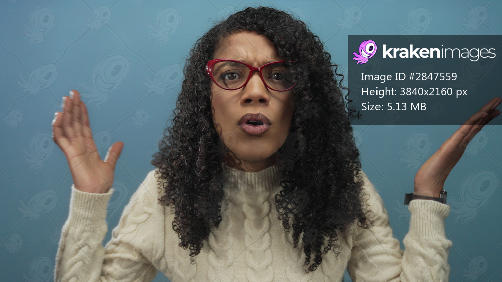 Woman with curly hair wearing red glasses and white cable knit sweater raises hands palms up in studio; confusion.