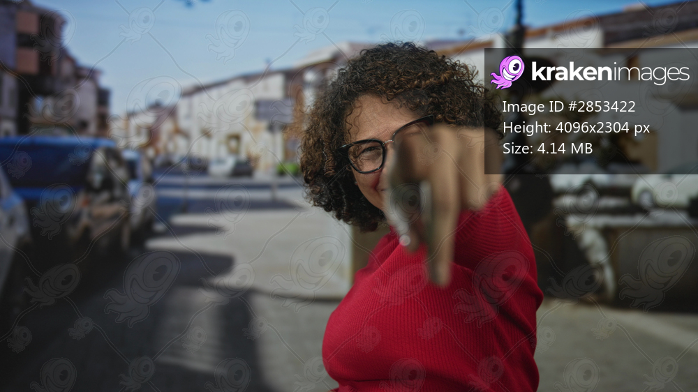 Woman with curly hair wearing red sweater and glasses poses peace sign by eyes on street while smiling under sunlight; playful joy.