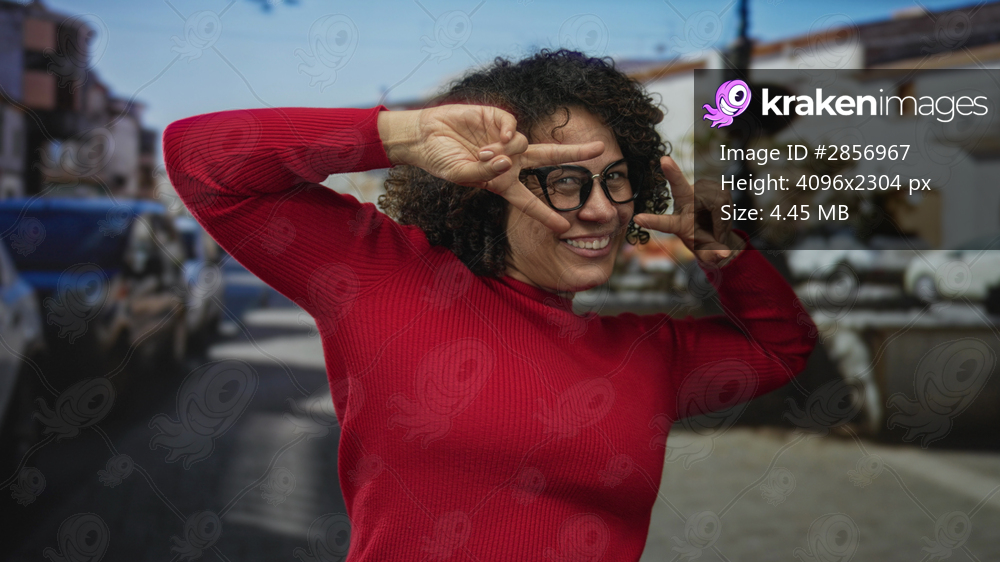 Woman with curly hair wearing red sweater and glasses poses peace sign by eyes on street while smiling under sunlight; playful joy.