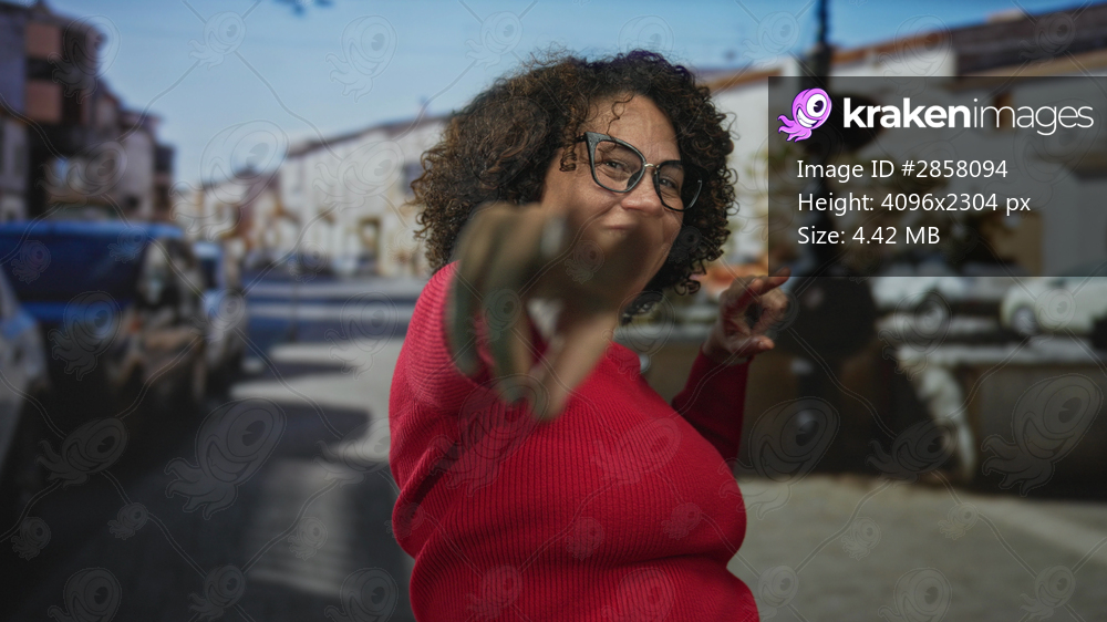 Woman with curly hair wearing red sweater and glasses poses peace sign by eyes on street while smiling under sunlight; playful joy.